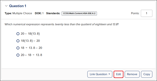 1. To make changes to a question on the assessment, click the Edit button.
