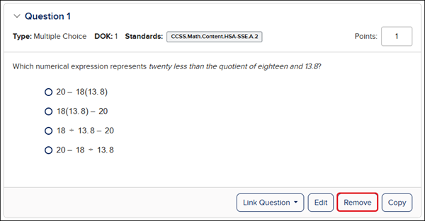 1. To delete a question from an assessment, click the Remove button.