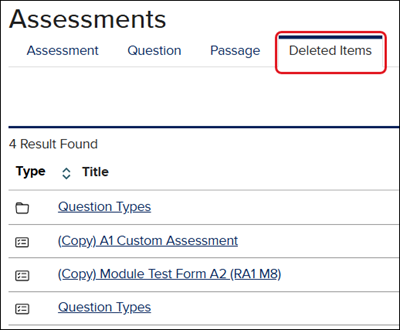 Any custom made assessments that have been deleted can be found under the Deleted Items tab on the Assessments page.