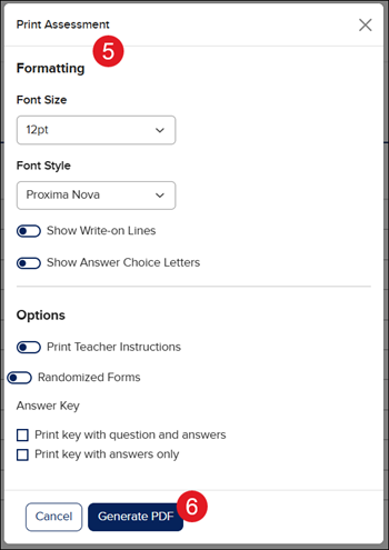 5. On the Print Assessment pop-up, select the preferred printing options.