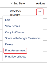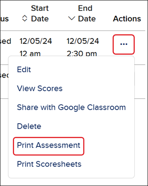 3. Click on the Options menu in the Actions column and click on Print Assessment.