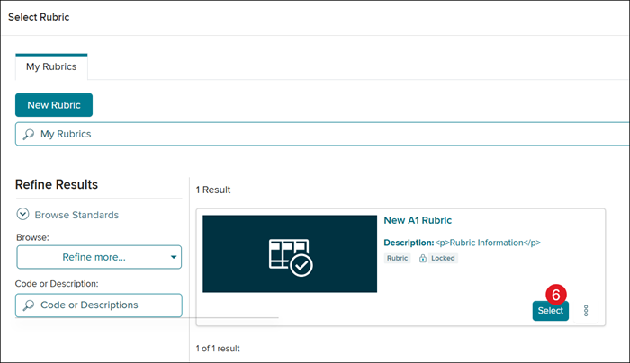 6. On the Select Rubric pop-up, click the Select button to attach the rubric to the question.