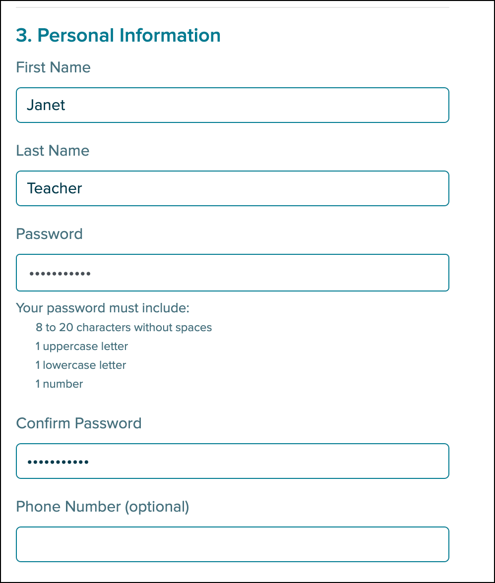 6. Under Personal Information, enter your First Name, Last Name, and Phone Number (optional).