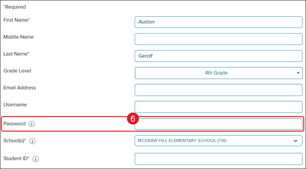If you want the system to autogenerate a Username and Password, you can leave those fields blank. If you want the student to have a specific Username and permanent Password, you will want to enter these fields.