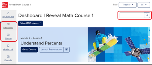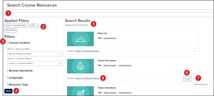 From the Dashboard or Course page, enter a keyword or click on the magnifying glass icon on the Resource search bar.