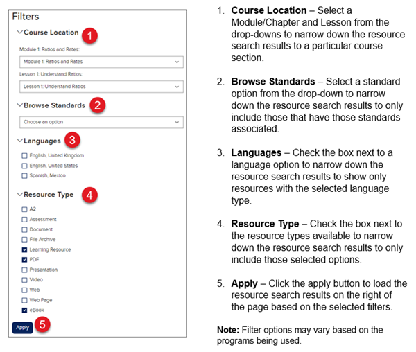 3. Filters - Use the Filters available to narrow down the resource results on the right of the page.