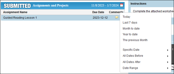 6. Submitted shows the assignments submitted in the current date range.  Click the calendar icon to view a different range of assignments.