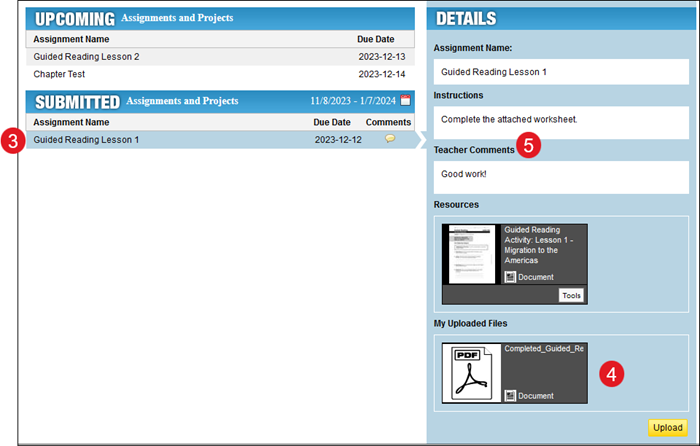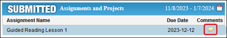 2. If your teacher has added comments to a submitted assignment, the Comments icon appears next to the assignment title.