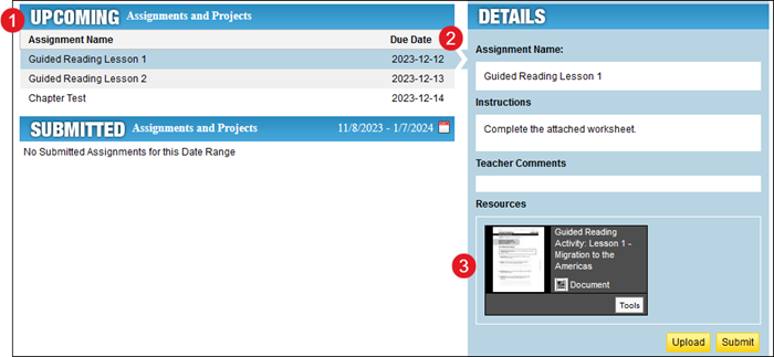 1. Assignments that are due are listed in the Upcoming section by Due Date If an assignment is Past Due , the Due Date appears in red .