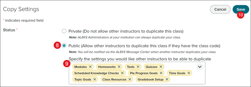 The Class Duplicate Settings option within ALEKS allows other teachers to duplicate your class settings to use when setting up their own class. This option is turned set to Private by default. Once you have made your class Public, teachers will be able to follow the steps in the create sub-class article to copy the class into their own.