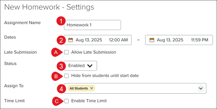 C. Check the box next to Time Limit if you want students to complete the assignment in selected time frame.
