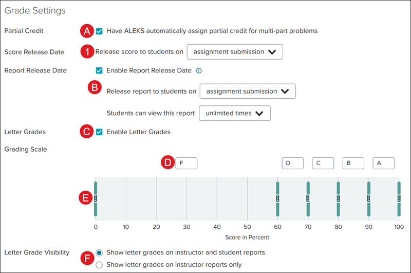 F. If Letter Grades is checked, select the radio button next to Letter Grade Visibility to allow for viewing on instructor and student reports, or only instructor reports.