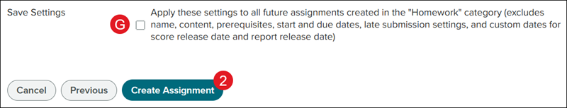 G. Click the checkbox next to Save Settings if you want to save these same settings for any future "Quiz", "Test", or "Homework" assignments.