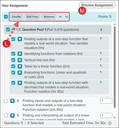L. Select questions to Shuffle, Edit Pool (if applicable), or Remove questions from the assignment. Use the arrows to move questions/pools up and down.