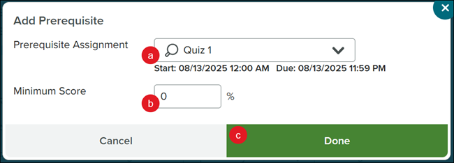 2. Select a Prerequisite for the assignment, if applicable, by clicking the +Add Prerequisite button.
