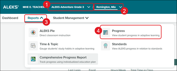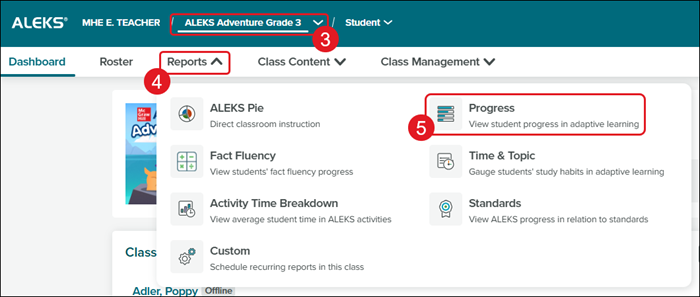 This article walks teachers through viewing the Progress Report for ALEKS Adventure in the New ALEKS view.