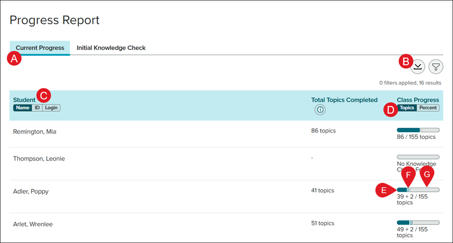 The Class Progress column is as breakdown of the total topics available and completed in the class for each student.