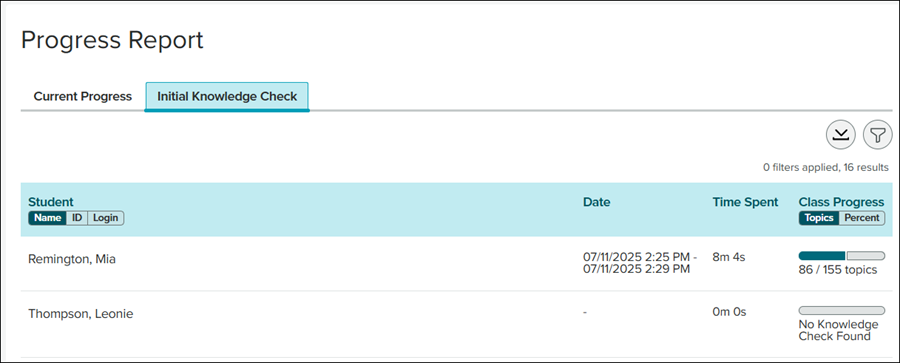 Click the Initial Knowledge Check tab to view the Date and Time Spent in the Initial Knowledge Check for each student.
