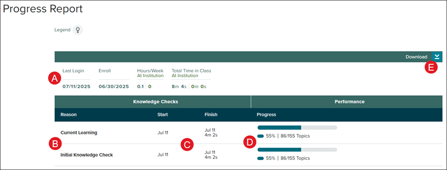 E. Click the Download icon to download an .xslx file file with the Class Progress by Percent, Class Progress by Topics, and Total Topics Completed information.