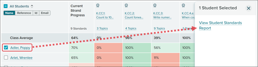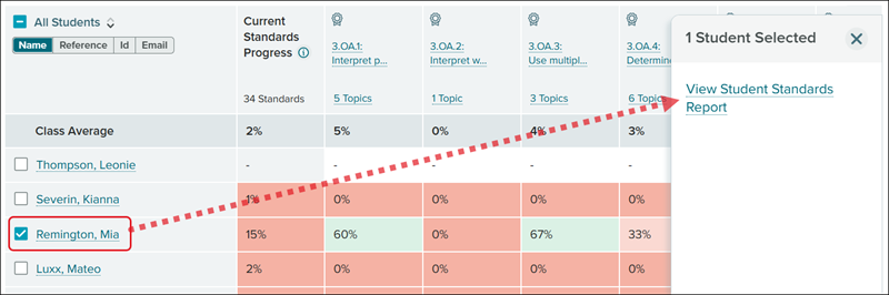 The Student Standards Report can be accessed through the class Standards report by clicking on a student's name and then clicking on the View Student Standards Report link in the right-side panel pop-up.