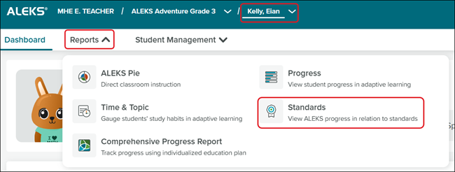It can also be accessed by selecting a student's name from the Student drop-down at the top of ALEKS after selecting a class, clicking on Reports, and selecting Standards from the menu.