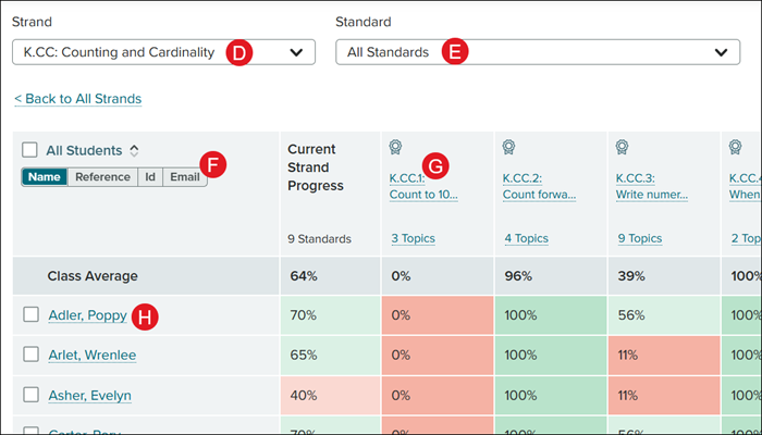D. Choose a Strand from the drop-down to filter down to that specific strand in the report. The table updates to display each student's current progress in the strand and the standards within the strand.