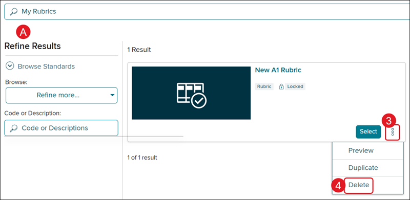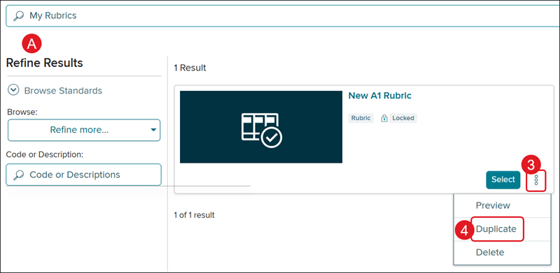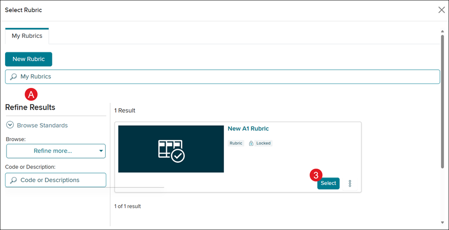 A. Use the My Rubrics search or Refine Results filters to locate the rubric you want to attach.