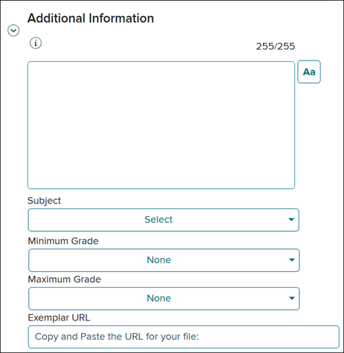 B. Click on Additional Information to add a description for the rubric, select a subject, a minimum and maximum grade, and add an exemplar URL. These are optional fields.