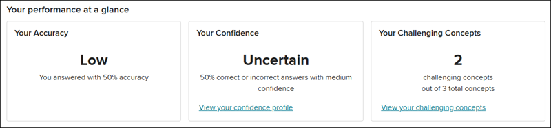 On the final screen, once all concepts have been answered correctly, the student will see their Accuracy, Confidence, and Challenging Concepts.