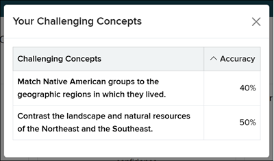 Clicking on the View your challenging concepts link provides a pop-up with a list of concepts that proved difficult for the student and their accuracy percentage.