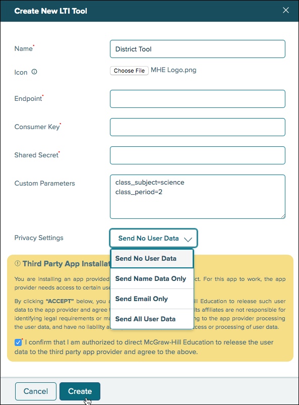 • Third Party App Installation Warning – You must confirm that McGraw Hill is authorized to send user data to the app provider in order to create the link.