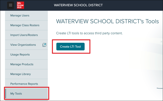 This feature allows administrators to create custom links which serve as a launch point to other McGraw Hill programs or third-party content providers. For districts that use ALEKS, Redbird, and StudySync® on the Open Learning Platform, links to the administrator role in these programs are automatically configured for you.