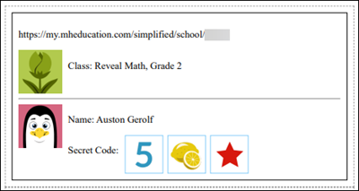 This will open a printable/savable document that contains a password card for each student rostered in the class. The card will contain the Login URL, Class Icon, the student's name, and the student's Secret Code that they will enter as their password.