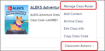 For ALEKS, Redbird, Achieve, Actively Learn, and StudySync, you will need to click the Classroom Actions menu and select Manage Class Roster from the menu.