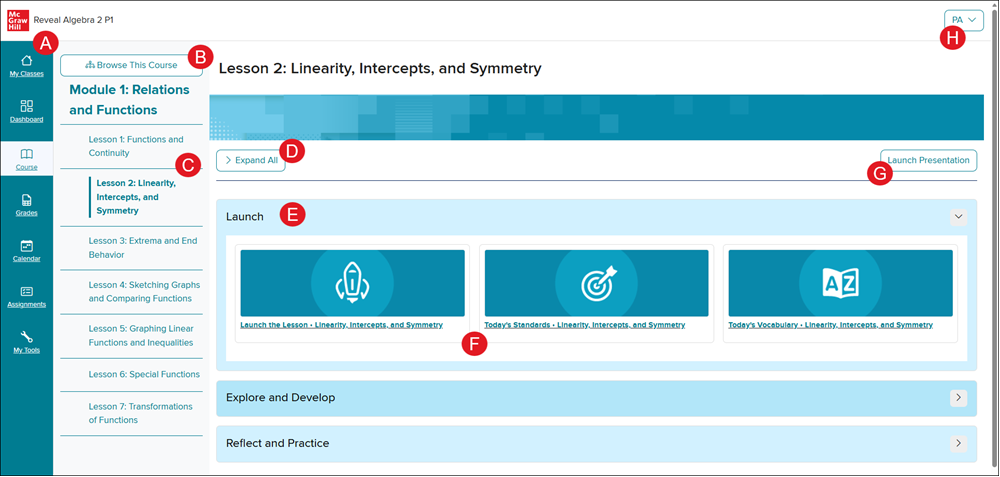 G. Launch Presentation - Click to open the selected lessons presentation. This is not an option for all lessons/courses.