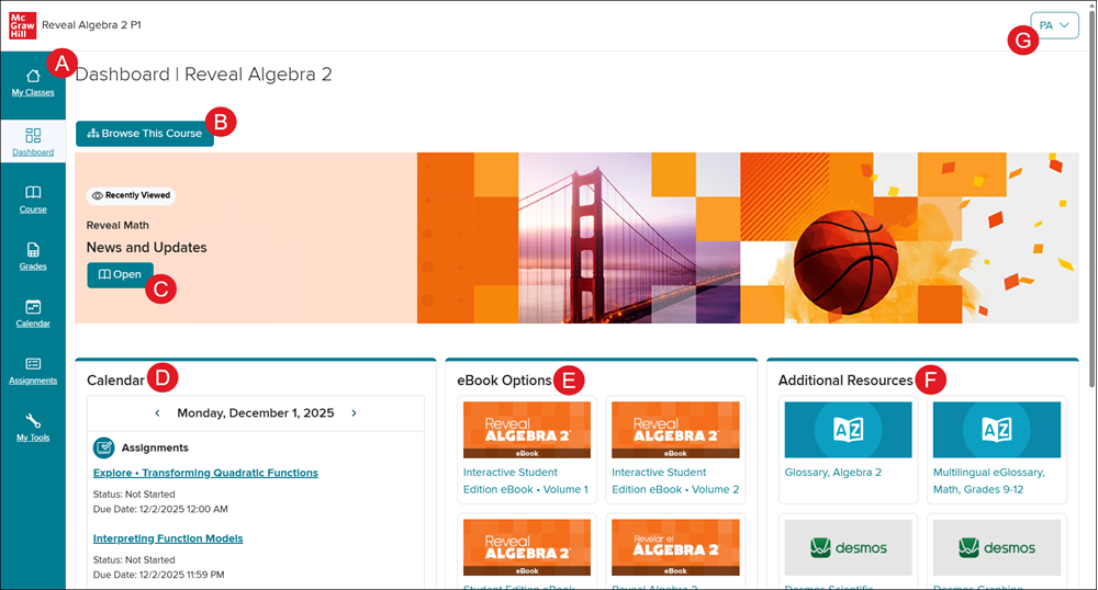 E. Resource Blades - Click to open/close the blade and view the available student resources.