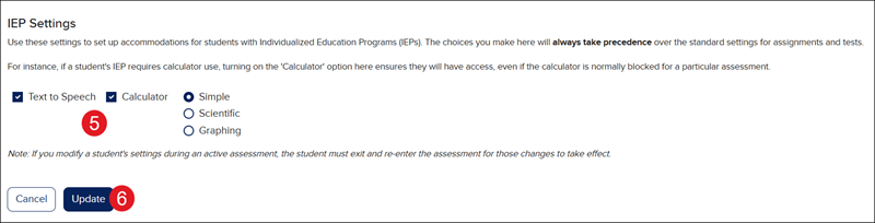 These settings allow teachers to set accommodations for students with Individualized Education Programs (IEPs). The settings that are activated will always take precedence over the standard settings for any assigned assessments.