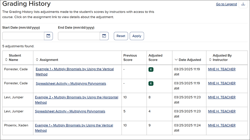 Enter a Start and End Date to filter the Grading History list to a specific range.
