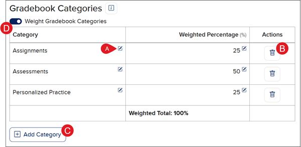 D. Toggle on/off the Weight Gradebook Categories (Weighted Percentage) option.