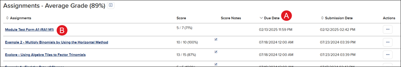 A. A student's gradebook will list each individual assessment they were assigned and their Score for each. It will also include the Due Date and the their Submission Date.