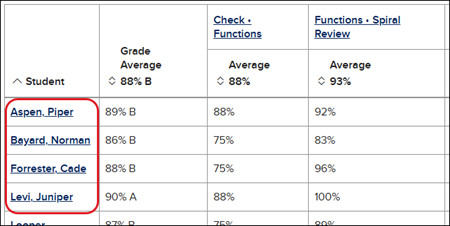 An individual student's gradebook can be accessed by clicking on their name in the Student column.