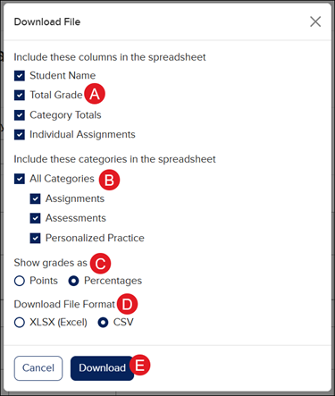 The Download File option allows you to export the gradebook into a XLSX or CSV file.