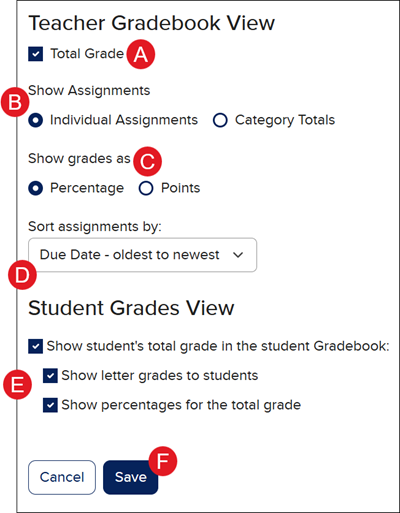 E. The Student Grades View options are checked by default. To not allow students to see a specific option, uncheck the box.