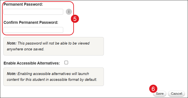 5. On the Edit Student Profile Information pop-up, enter a Permanent Password and Confirm Permanent Password.