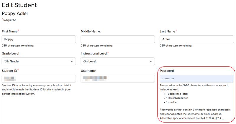 Note: Making adjustments to the student's Name, Student ID, Username, and Password changes these fields for all classes they are assigned to.