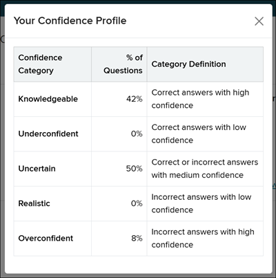 Clicking on the View your confidence profile link provides a pop-up with a breakdown of the student's different confidence levels.