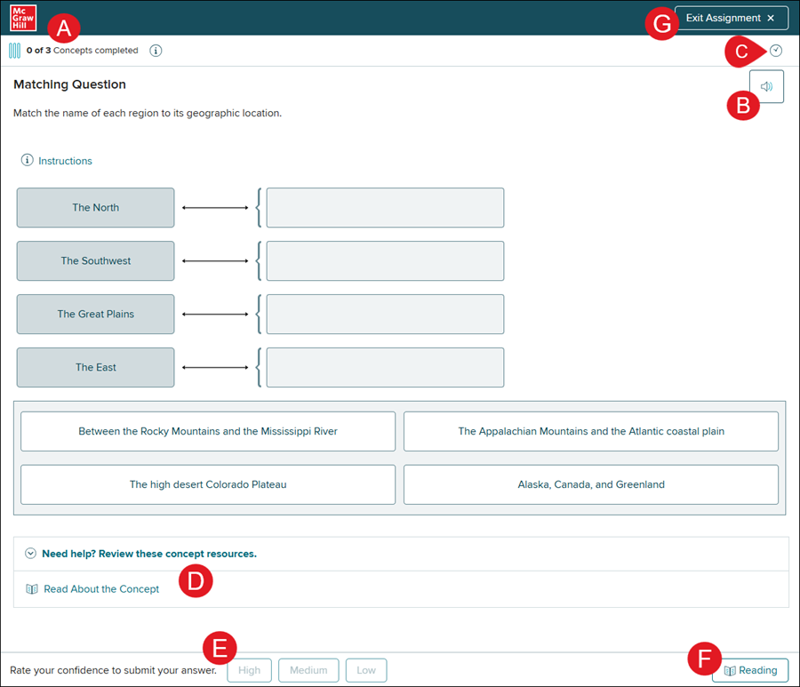 F. The Reading button navigates the student back to the reading portion for the concept they are completing. If the program uses resources instead of reading, this button will not be available.