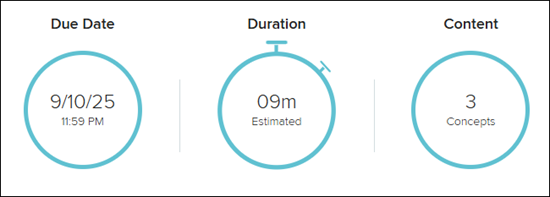 When the student launches the SmartBook resource, they will first see the Overview page. This screen will provide information on the Due Date, estimated Duration, and the number of Concepts.