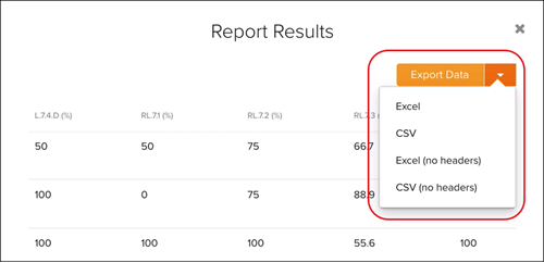 - A box will come up that will show you all the information that is included in the report. You will have the option to Export Data to Excel or CSV by clicking on the arrow button.