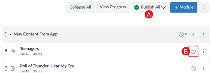 For students to be able to access the assignments, you first need to publish them within Canvas by clicking the Publish All (B) option or by clicking the Publish (C) button on each individual assignment.